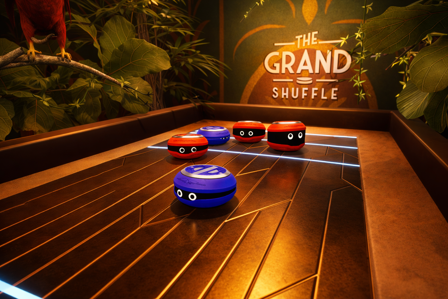 The Shuffly table comes with a camera tracking system installed that translates physical pucks' location and movement on the board to virtual pucks displayed in the Unreal Engine application.